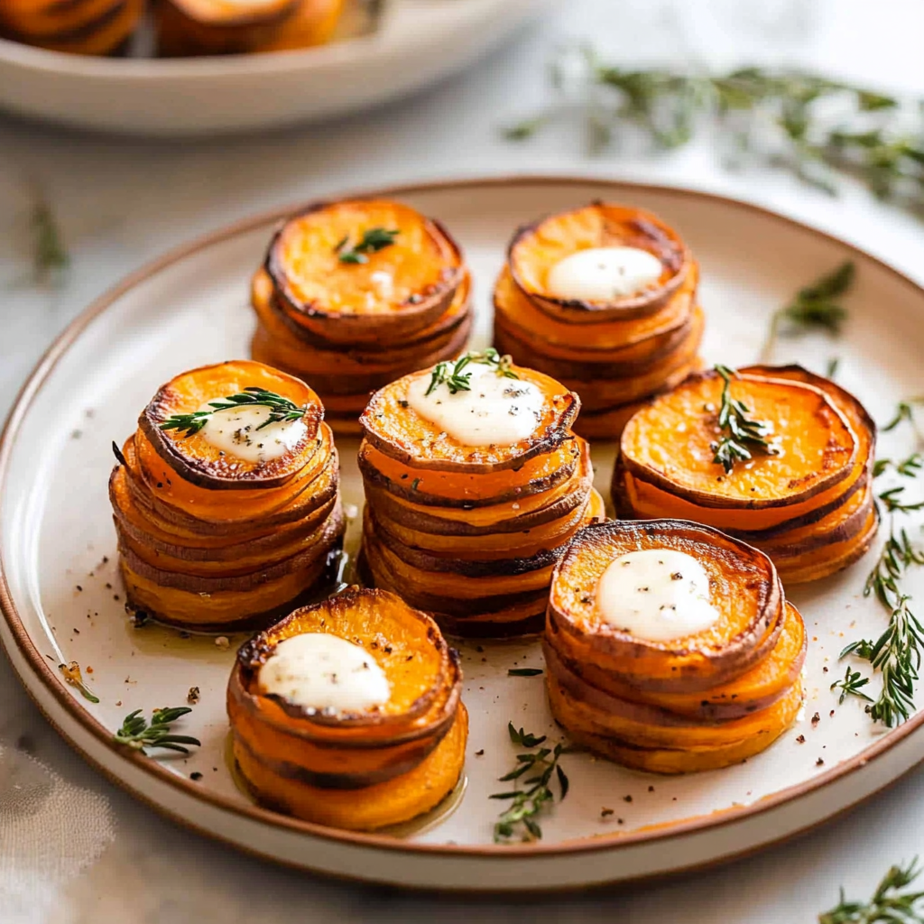 These sweet potato stacks pair beautifully with proteins like chicken, fish, or plant-based options like lentils. They also work great alongside your favorite grain dishes!