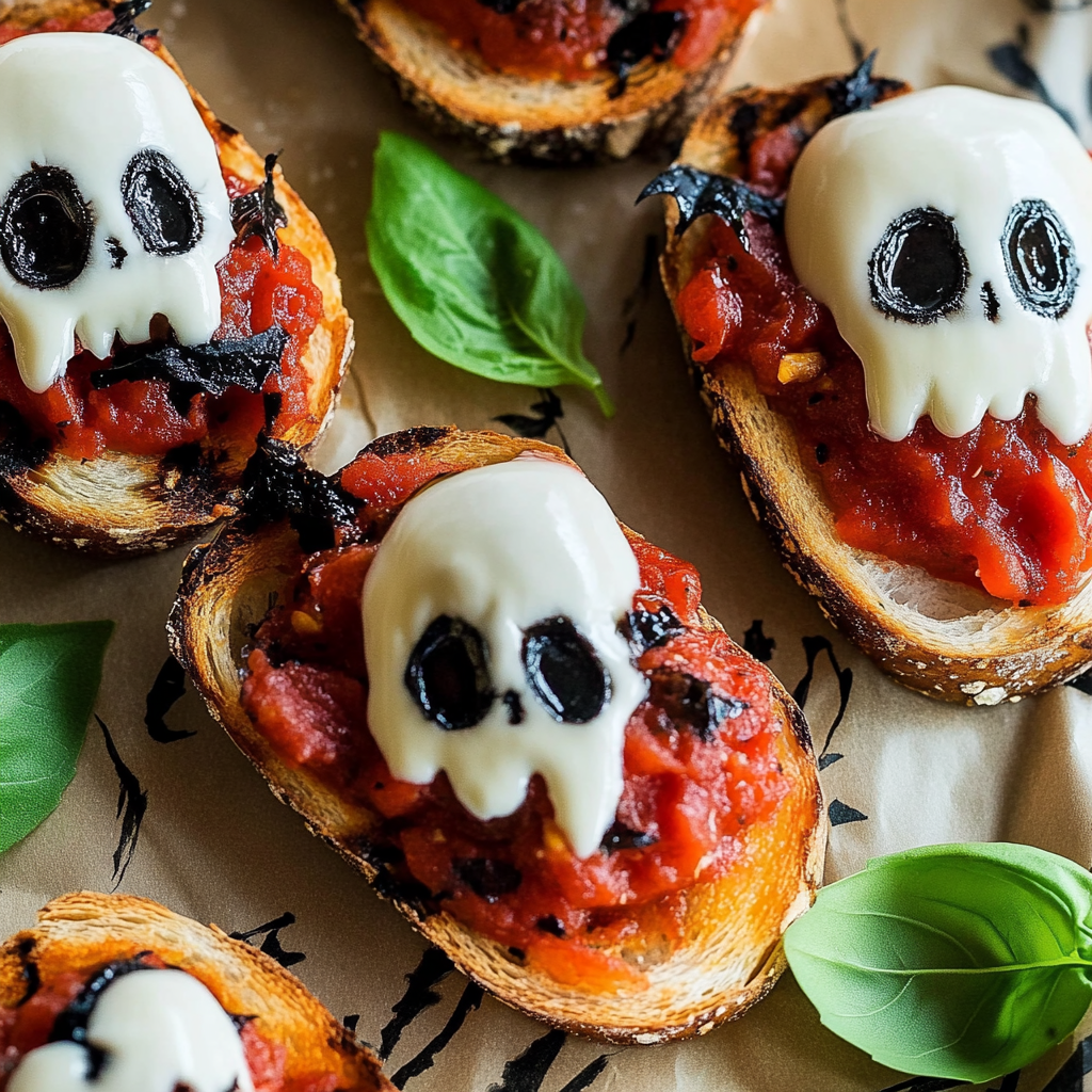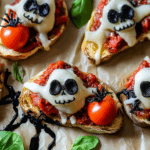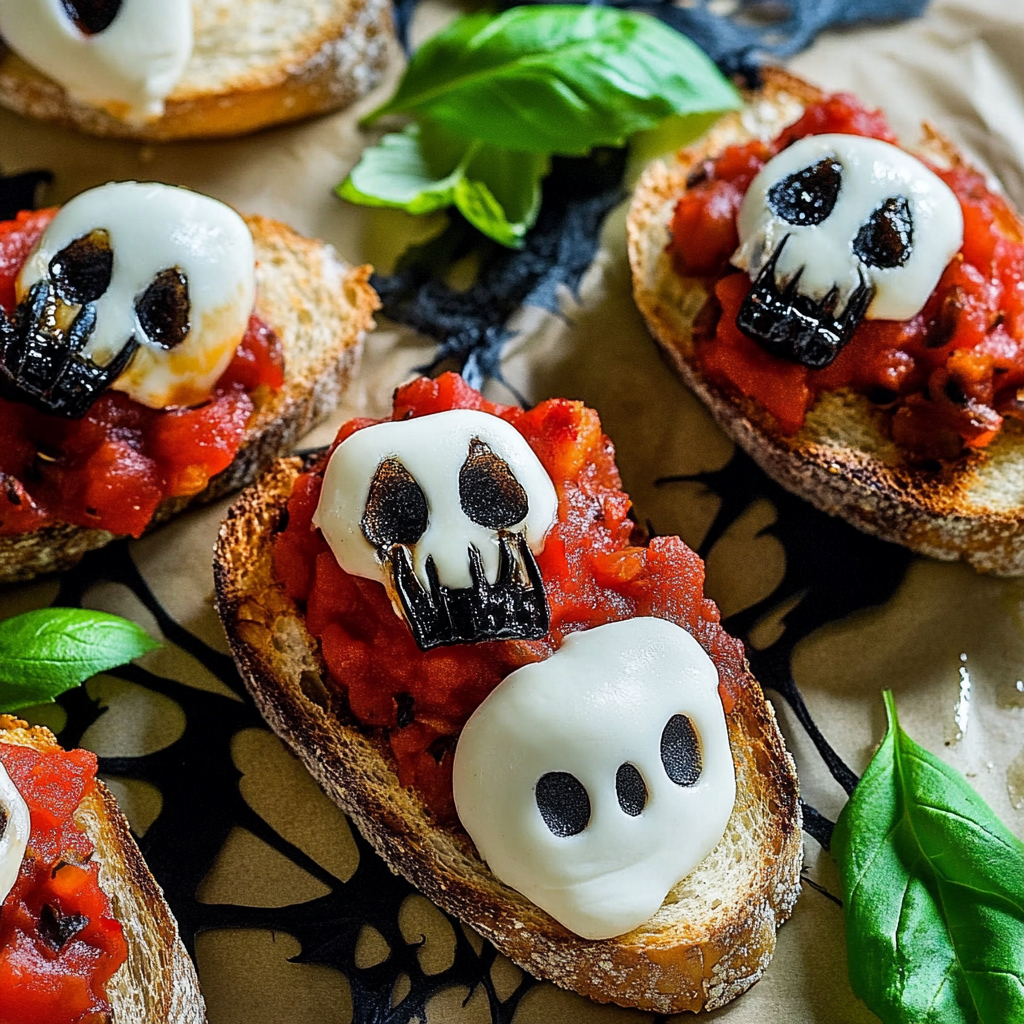 Get ready to impress your guests with this Halloween Bruschetta Appetizer! This playful twist on the classic bruschetta features gooey mozzarella skulls, sweet roasted cherry tomatoes, and a striking black pesto spread, making it an eye-catching addition to any festive gathering. Not only is this dish packed with flavor, but it’s also incredibly easy to make, perfect for busy weeknights or spooky celebrations. Children will love helping in the kitchen, especially when it comes to shaping the mozzarella into fun skulls. With its delightful presentation and irresistible taste, this appetizer is bound to become a favorite at your Halloween festivities.
