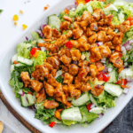 Transfer the dressed lettuce into two large plates or bowls. Then top each serving with diced red onions, bell pepper, cucumber, and finish off with the honey hot chicken mixture. If you’re feeling indulgent, sprinkle some shredded cheese on top! Serve immediately while everything is fresh and vibrant.
