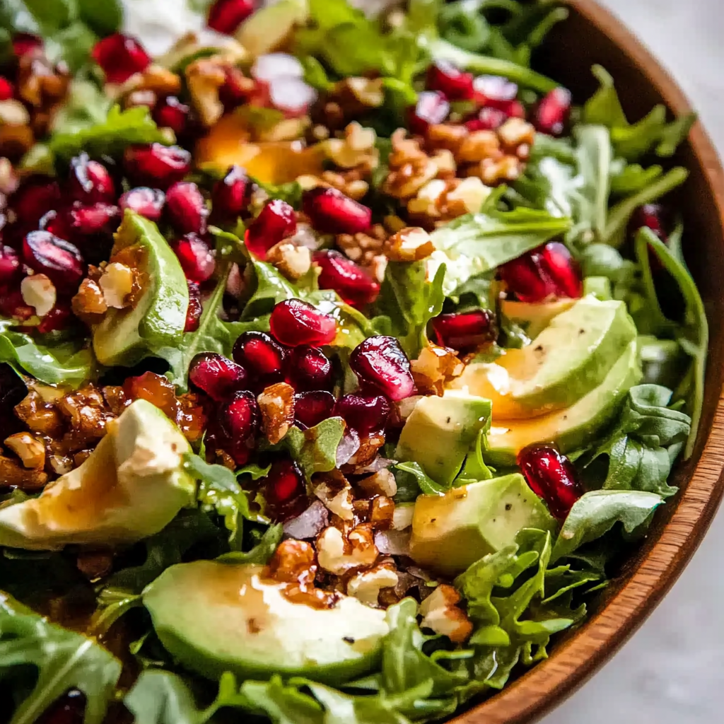 • Colorful Presentation: The bright colors of the pomegranate seeds and greens make this salad visually stunning on any table.