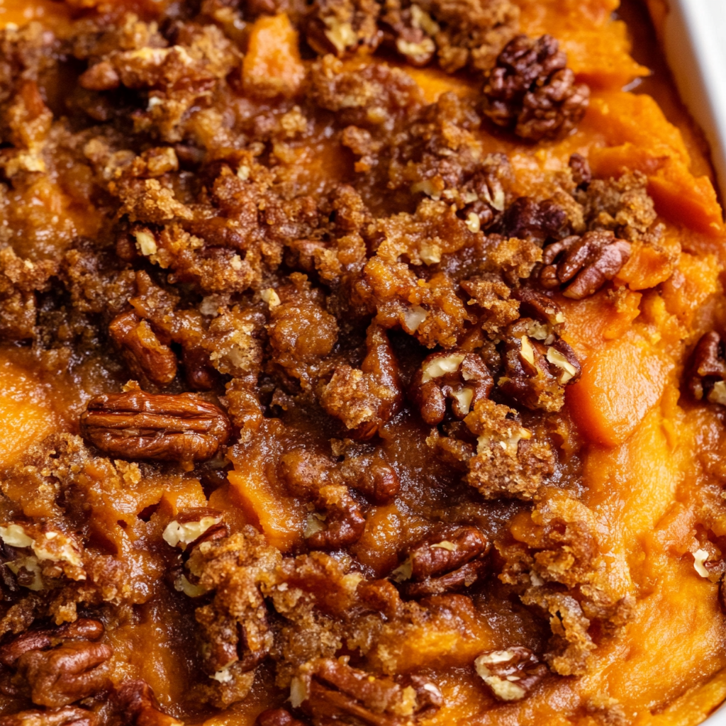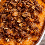 - In another bowl, mix brown sugar, flour, melted butter, and chopped pecans; sprinkle over the sweet potato base.